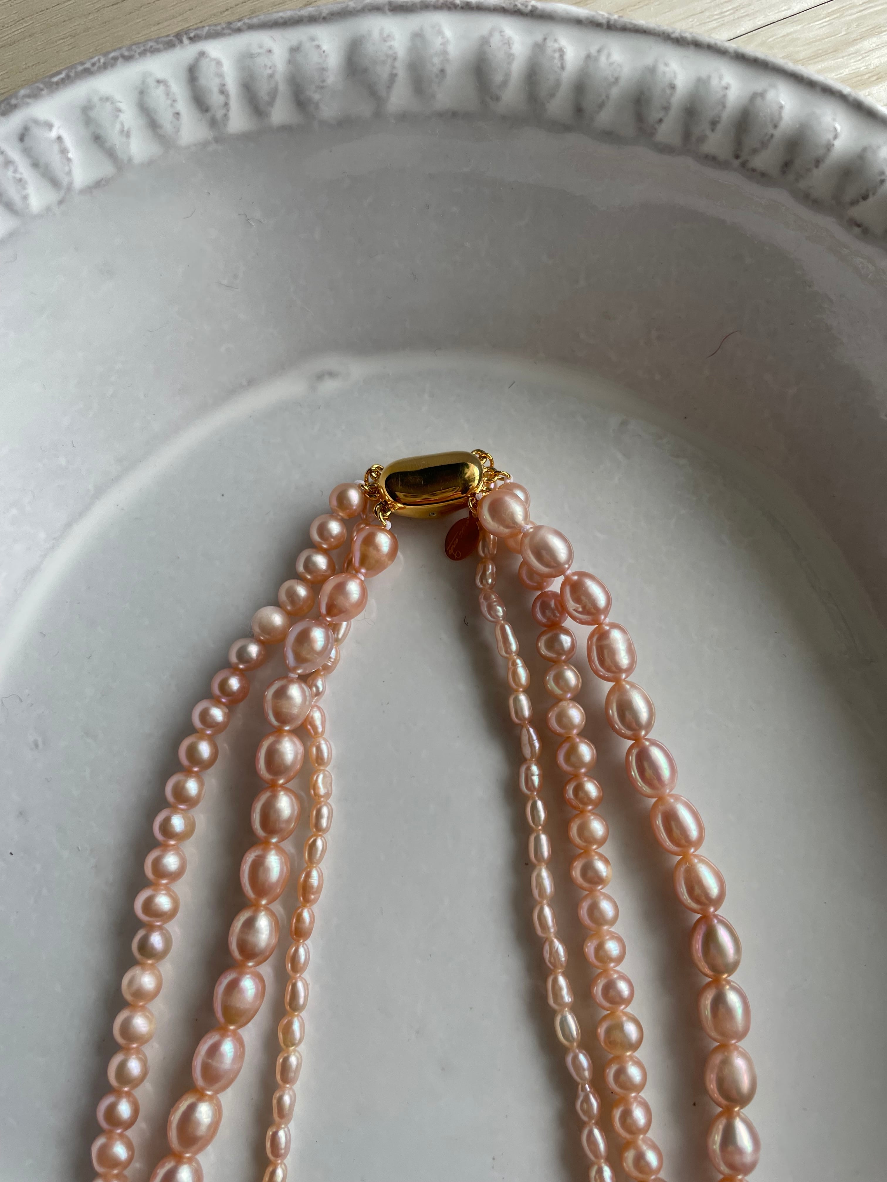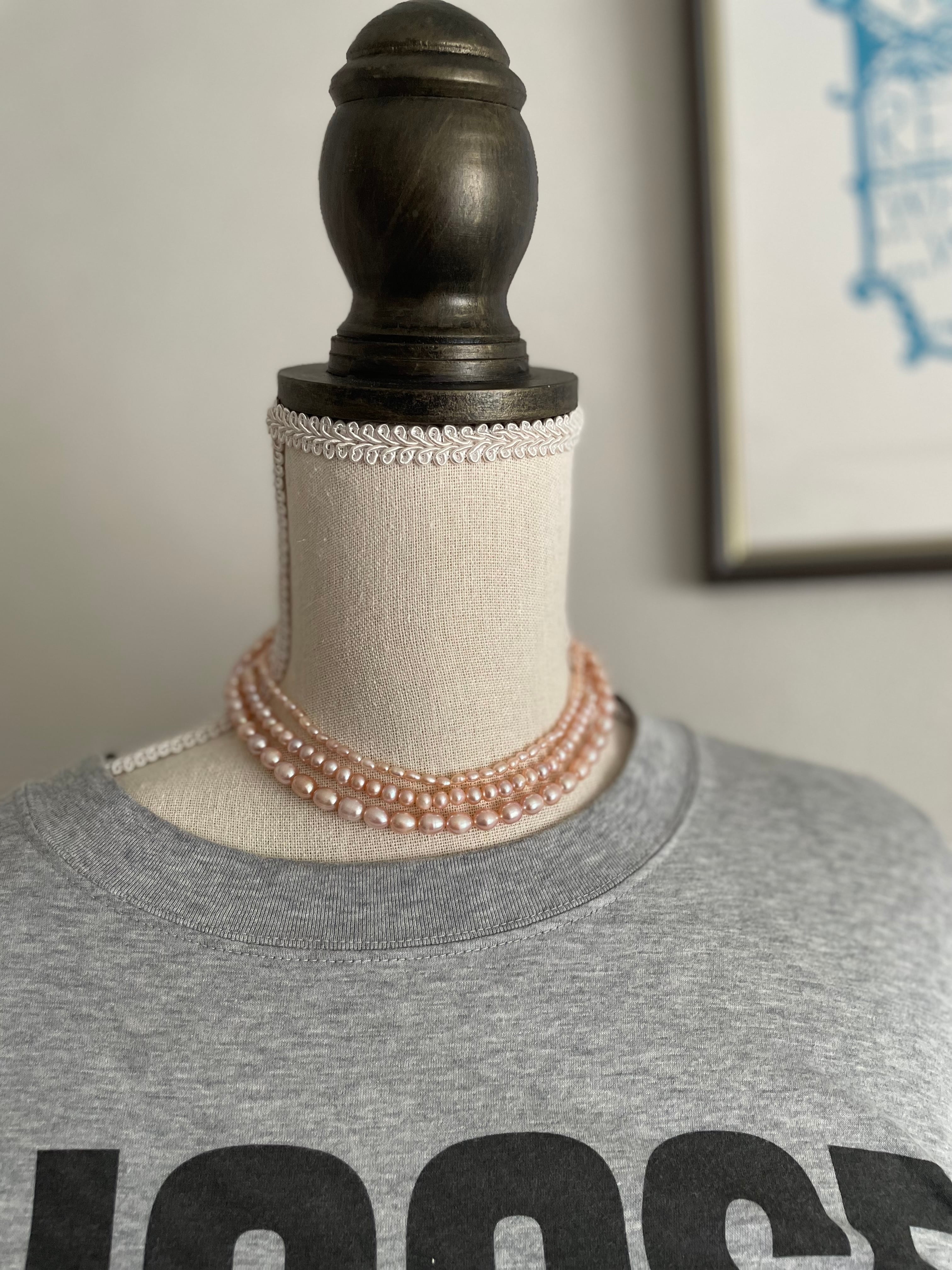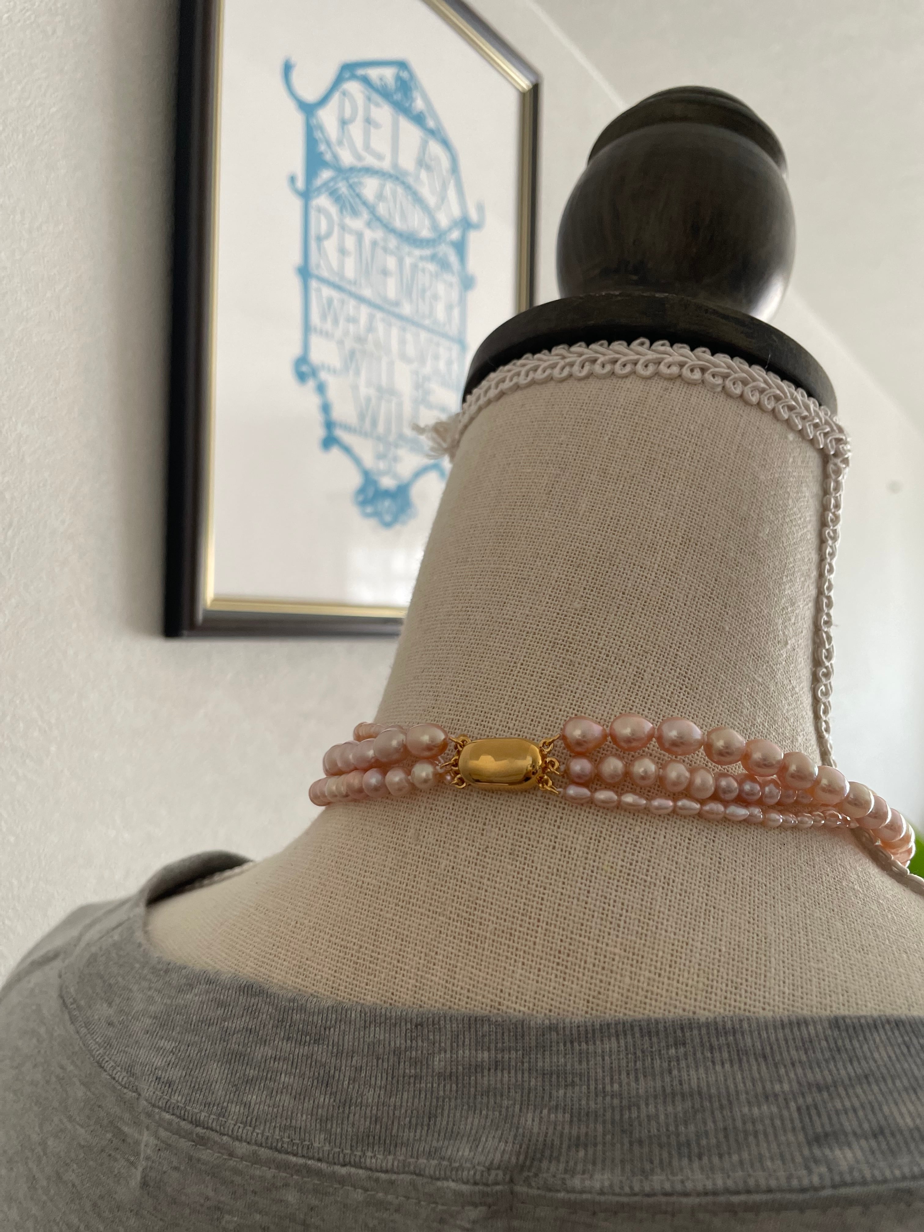 naturalcolorの優しいpinkcolorの大きさの違う3つのpearlを組み合わせたネックレスです。