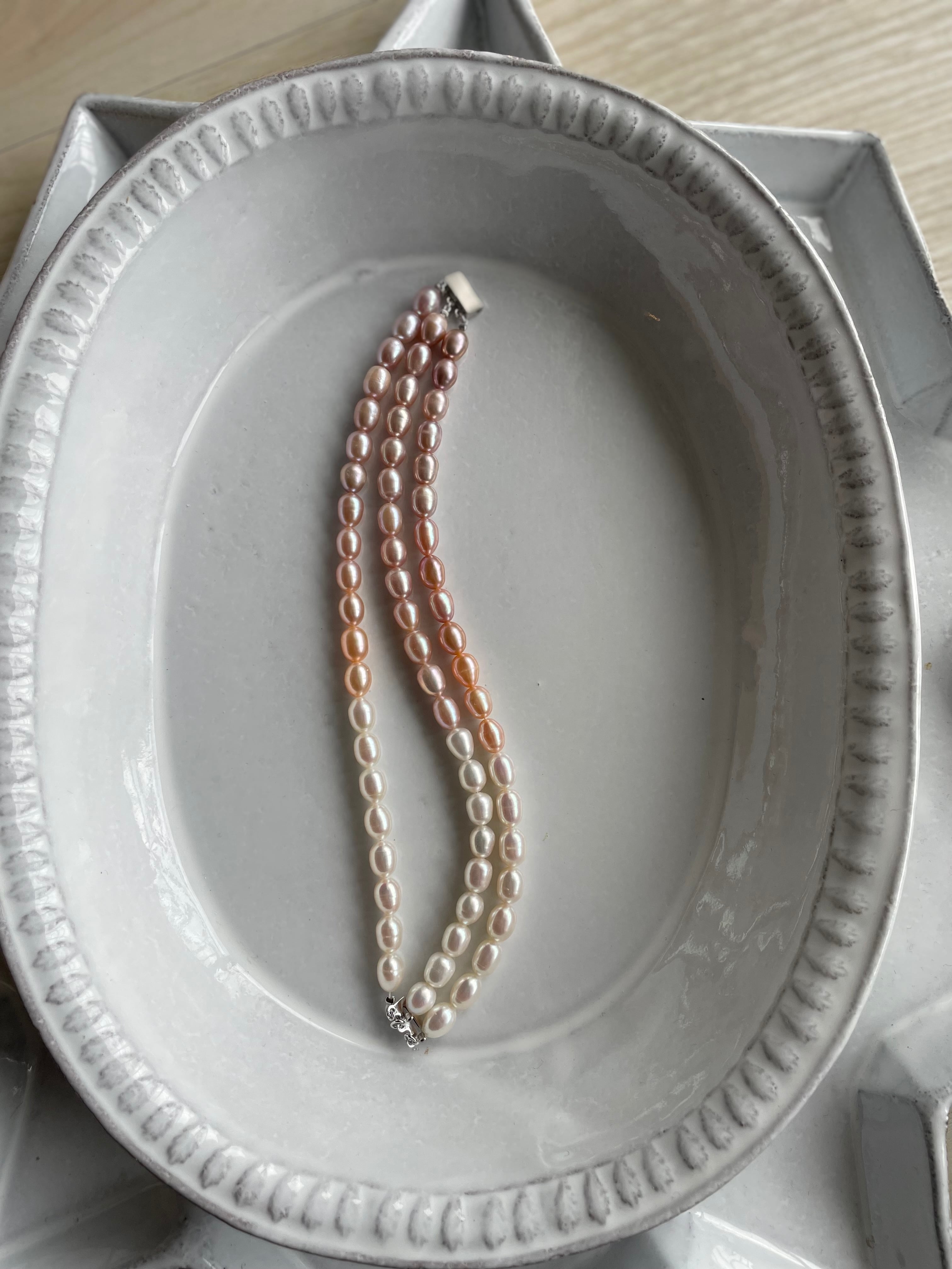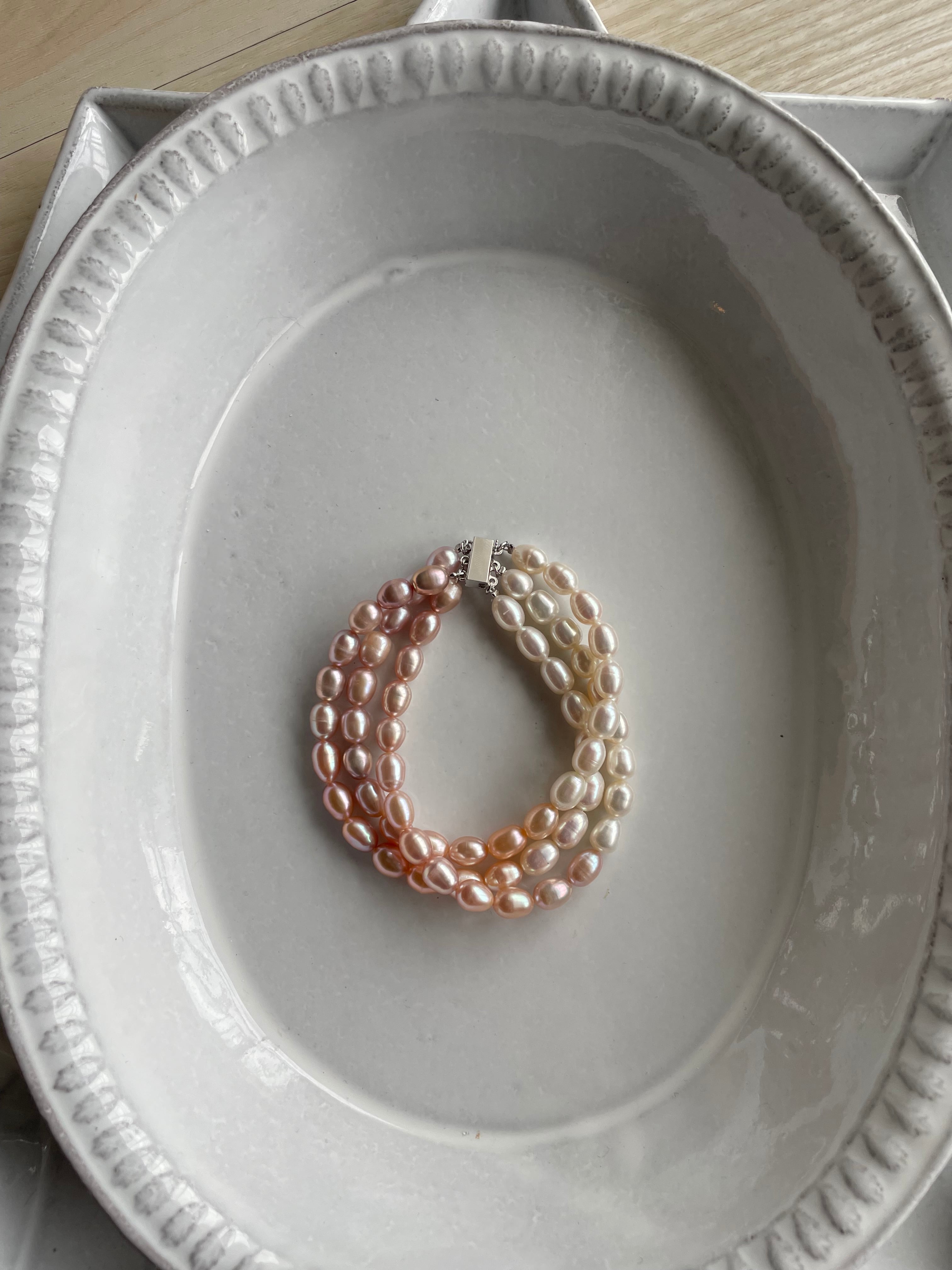 白から淡い天然色のpinkのグラデーションが美しい3連のブレスレットです。