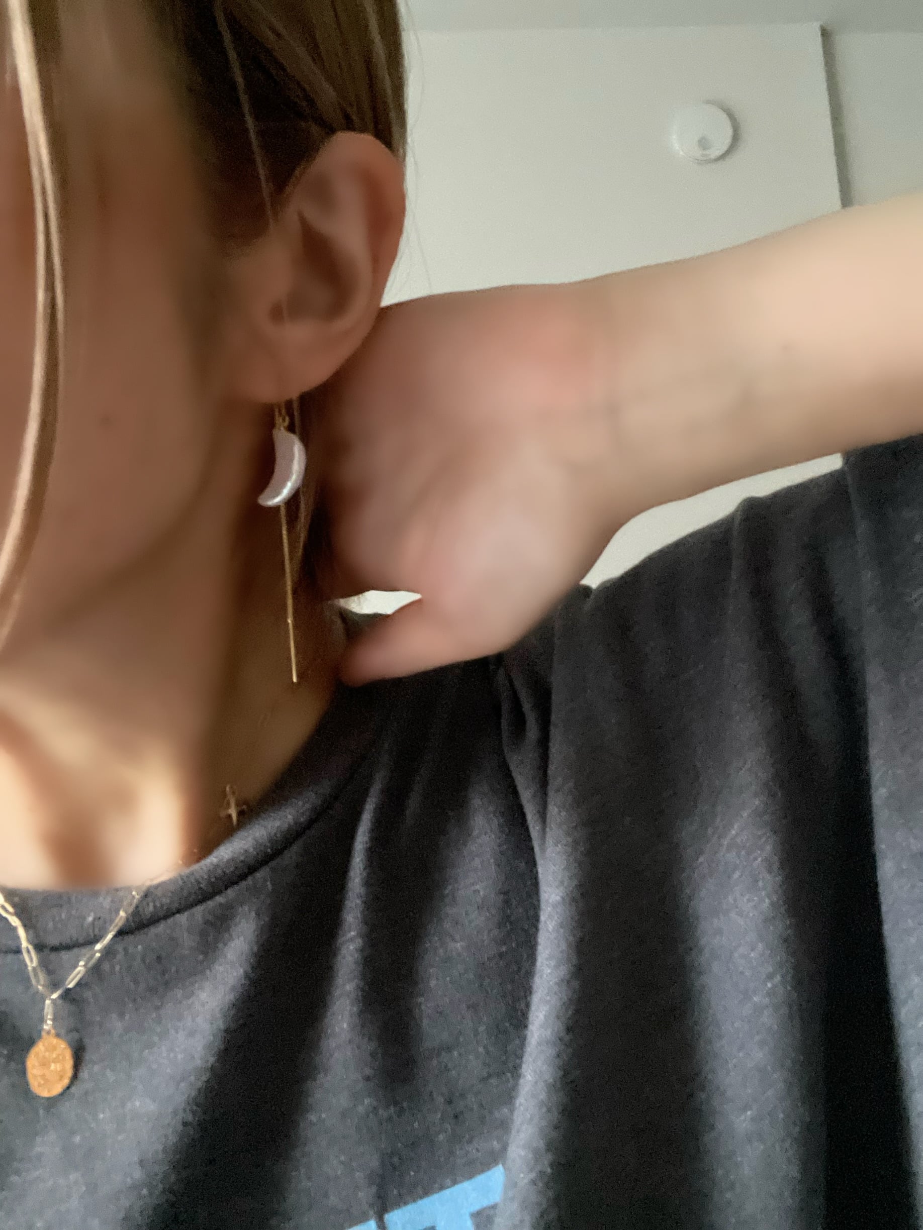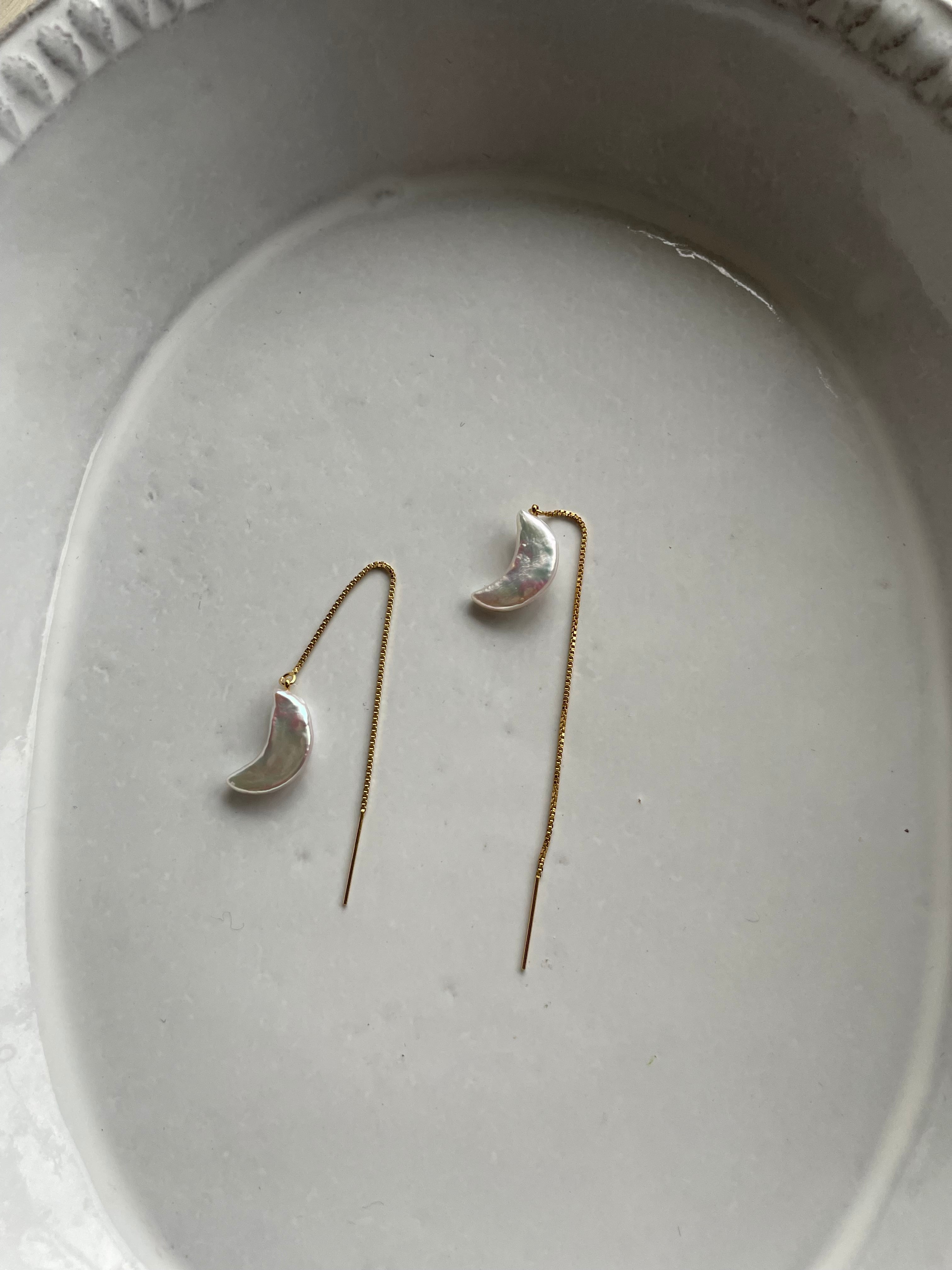 大変に珍しい三日月の形のパールにチェーンを付けて、ロングチェーンピアスにしました。