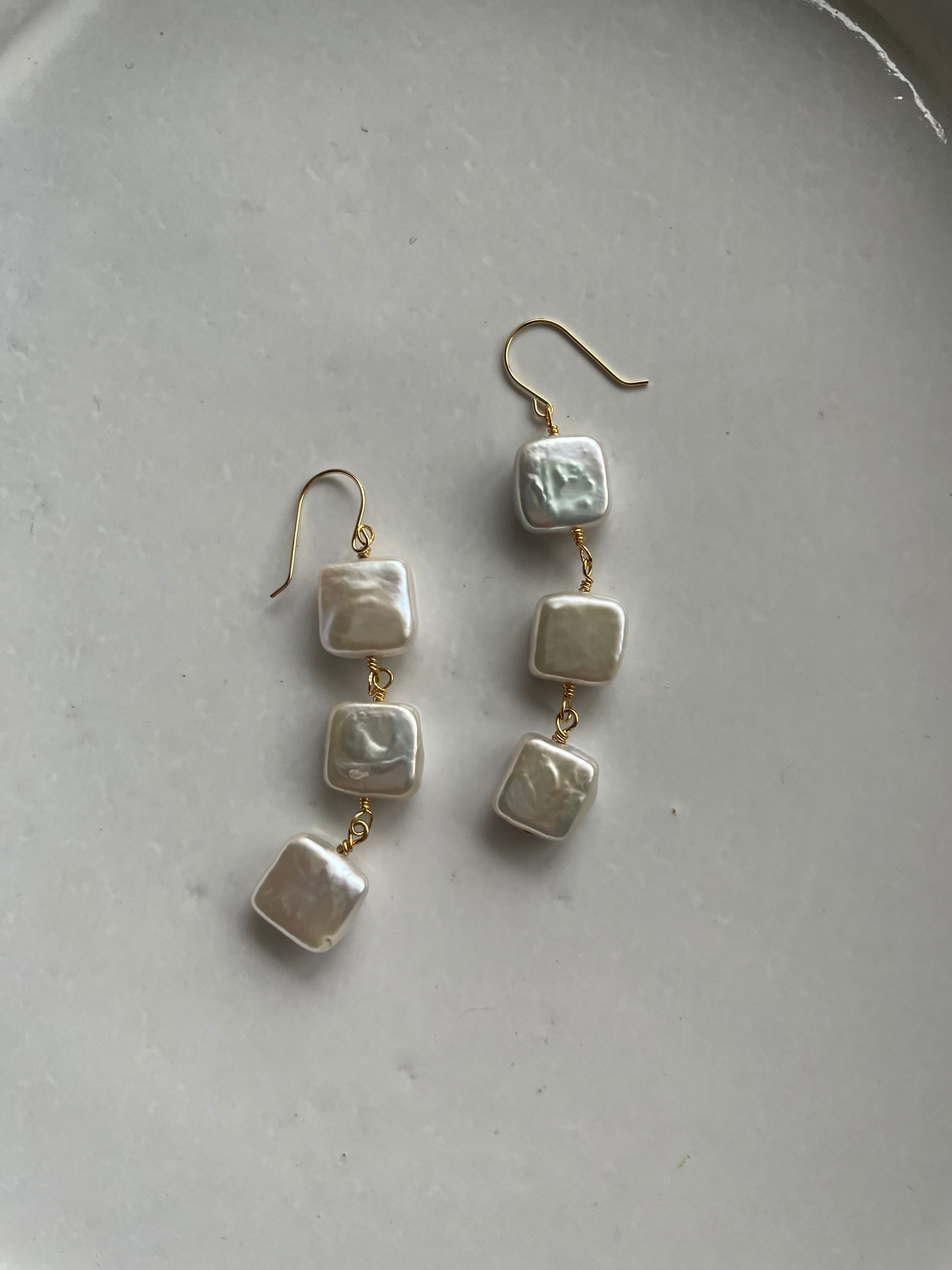 とても珍しい四角の淡水パールを3つ繋げて揺れるピアスにしました。