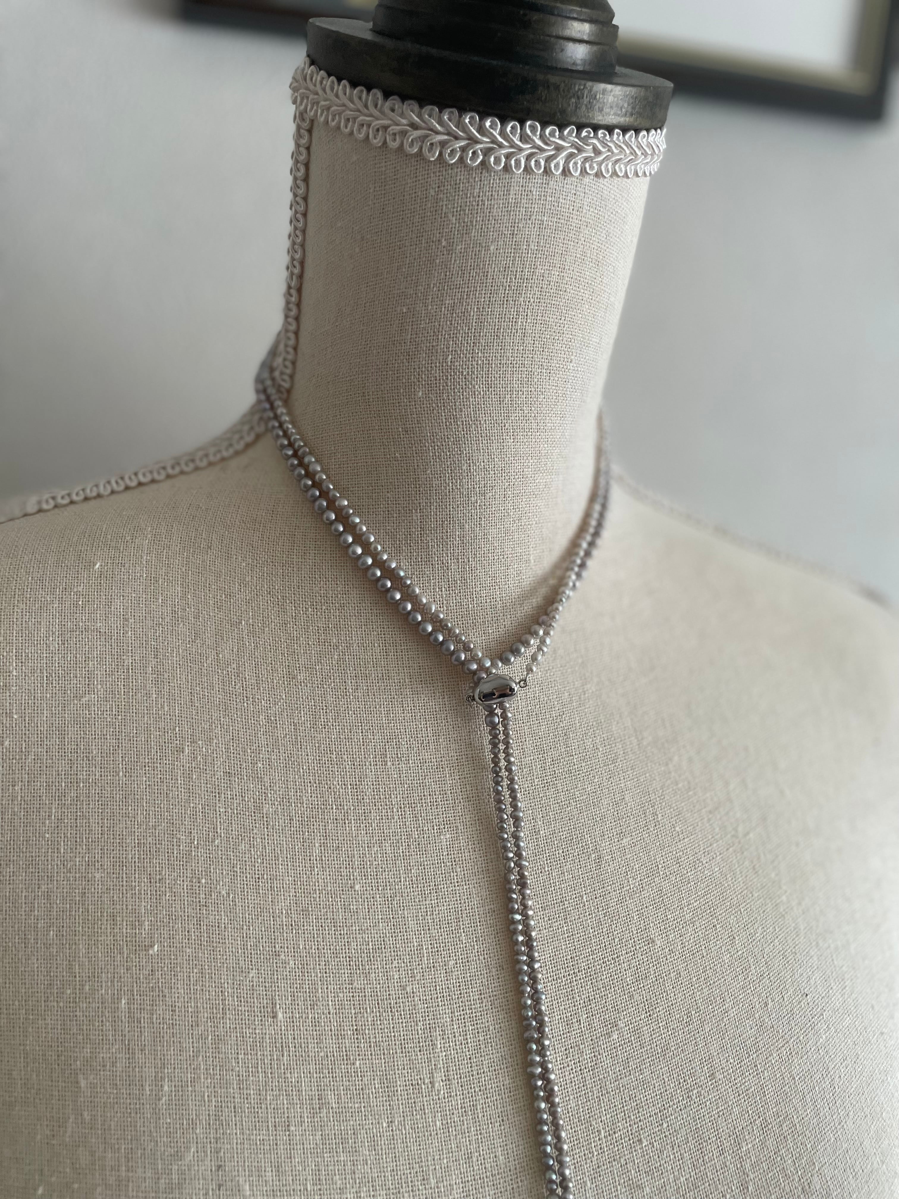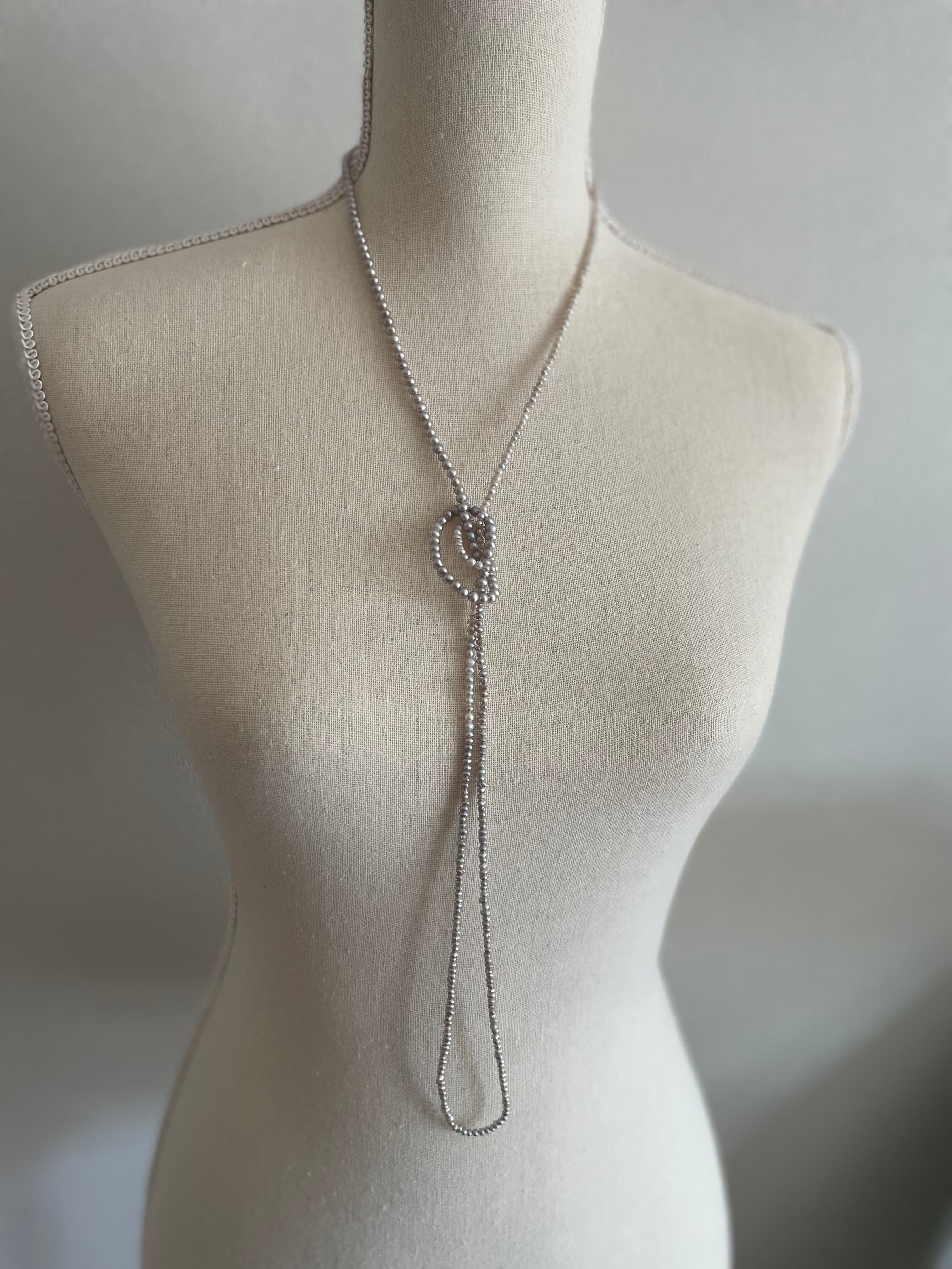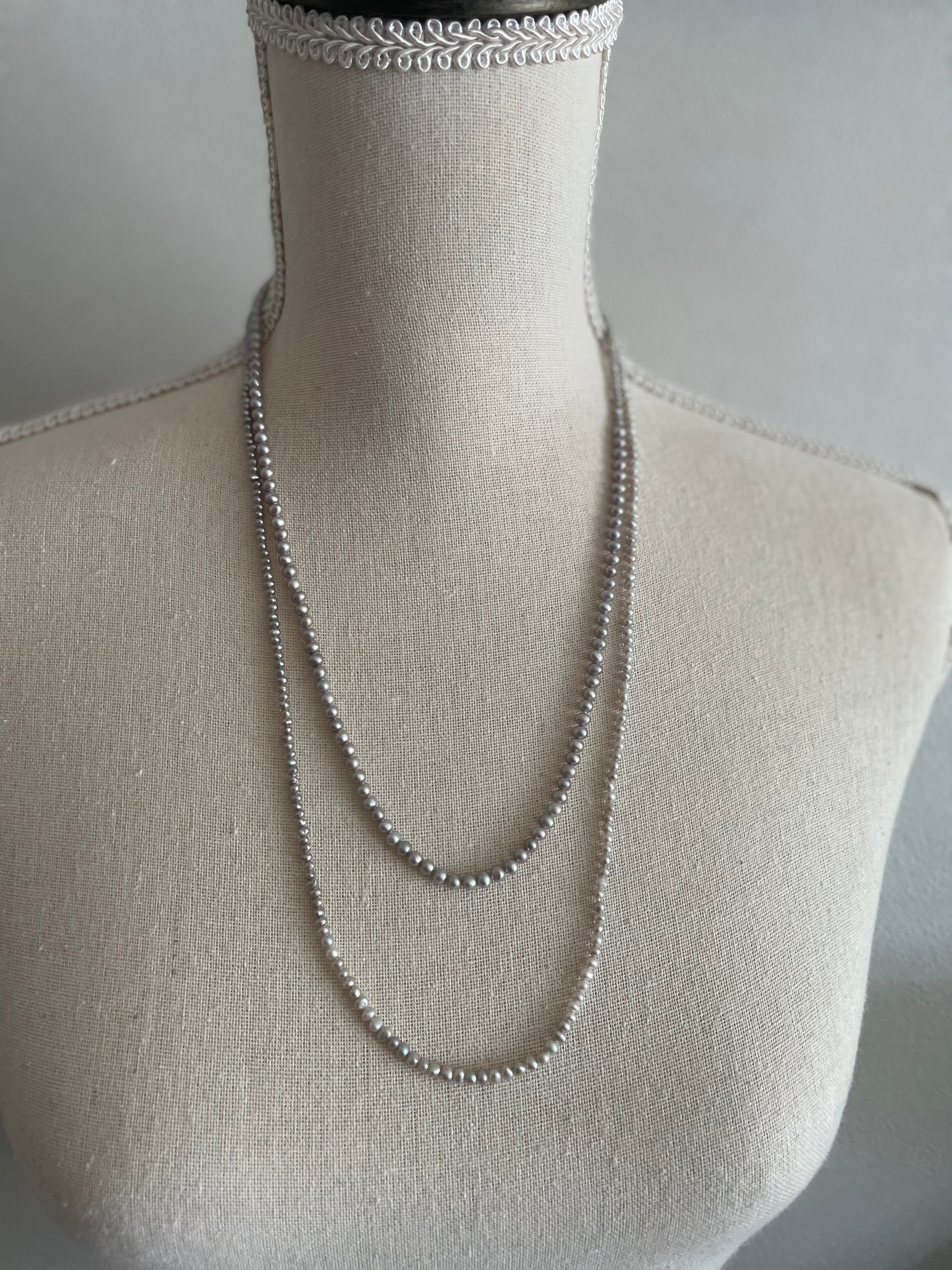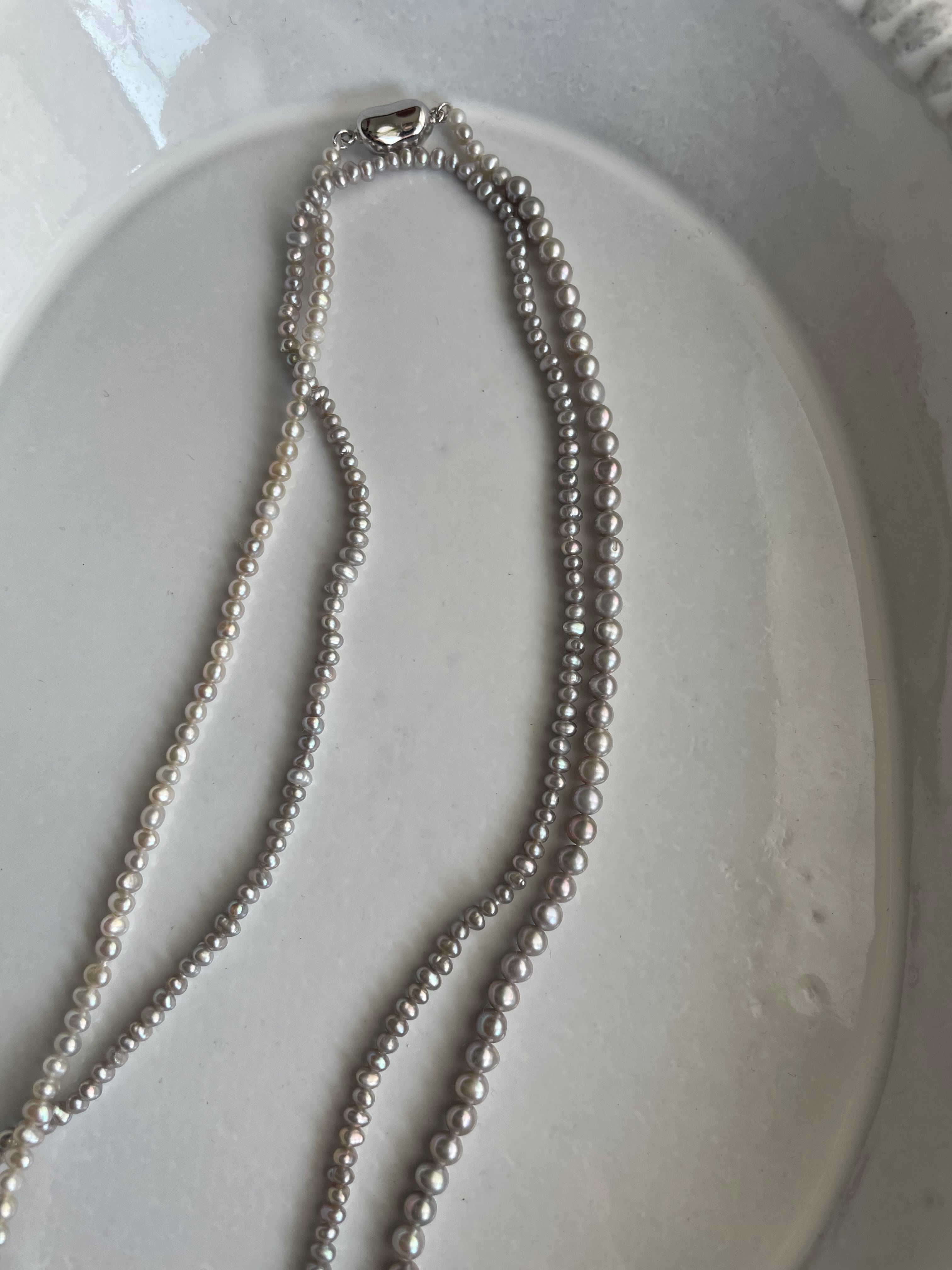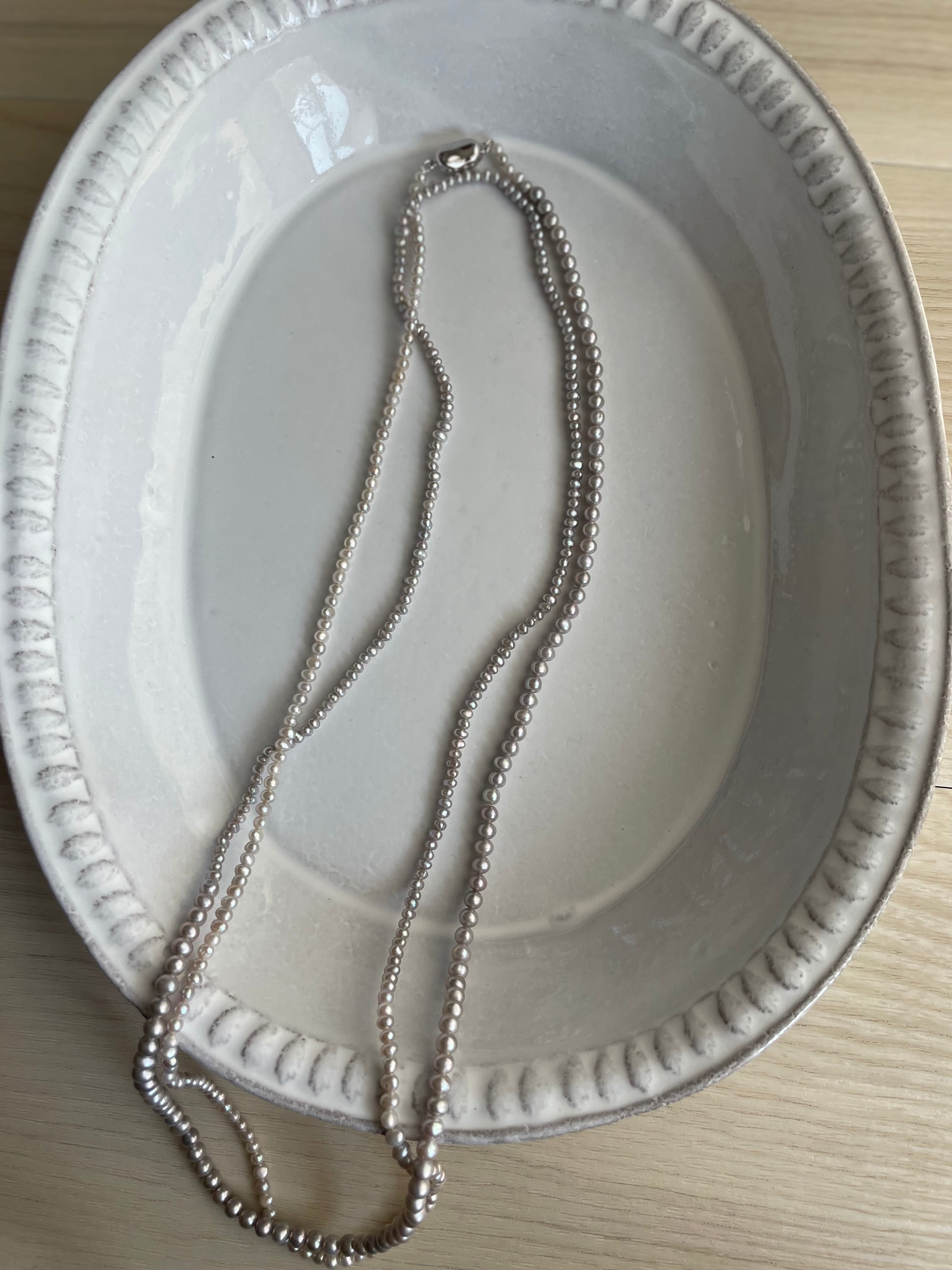大きさが少しずつ異なる希少なsilver色のpearlを組み上げて、126㎝のsuperlongに組み上げたnecklaceです。