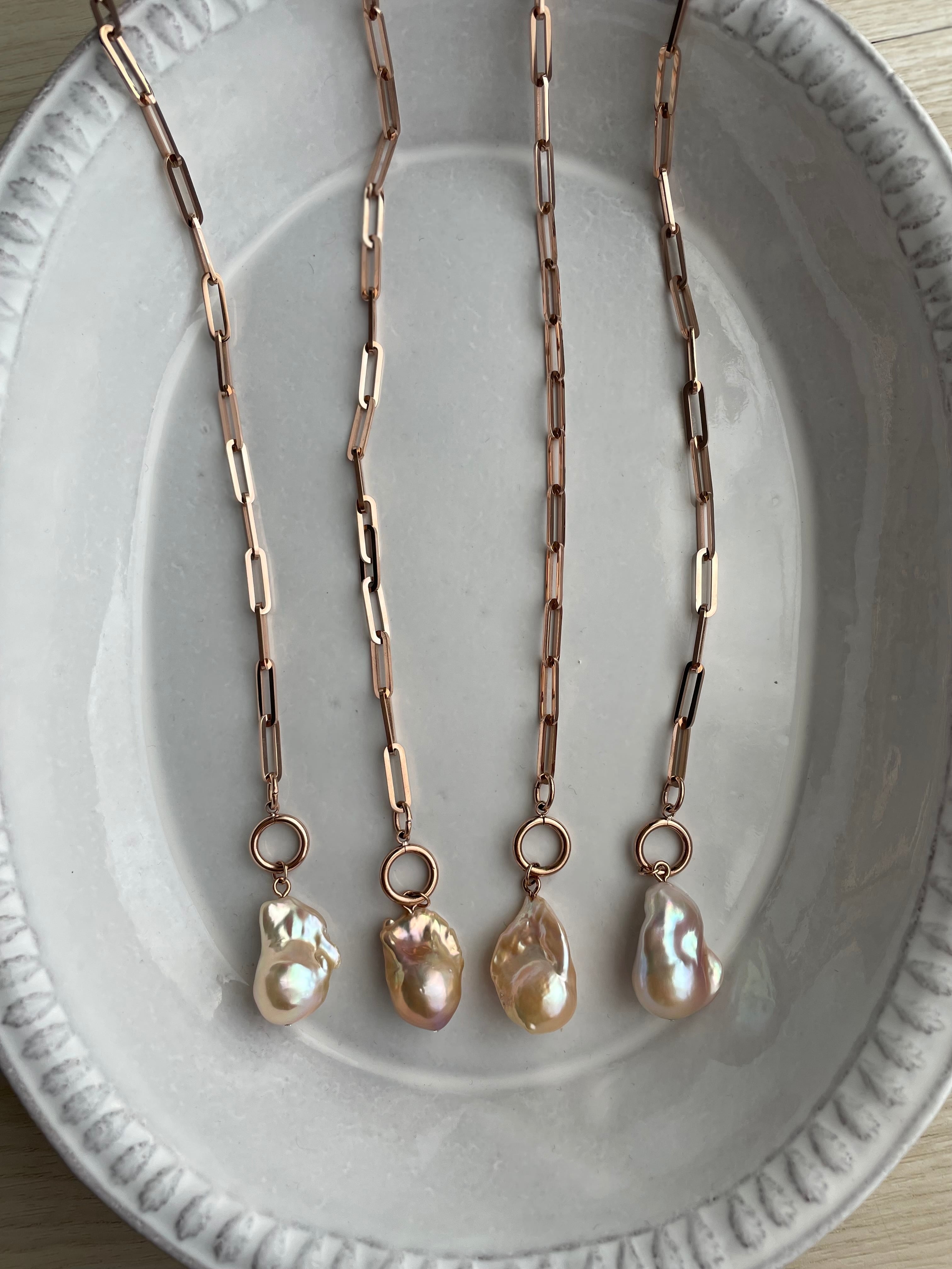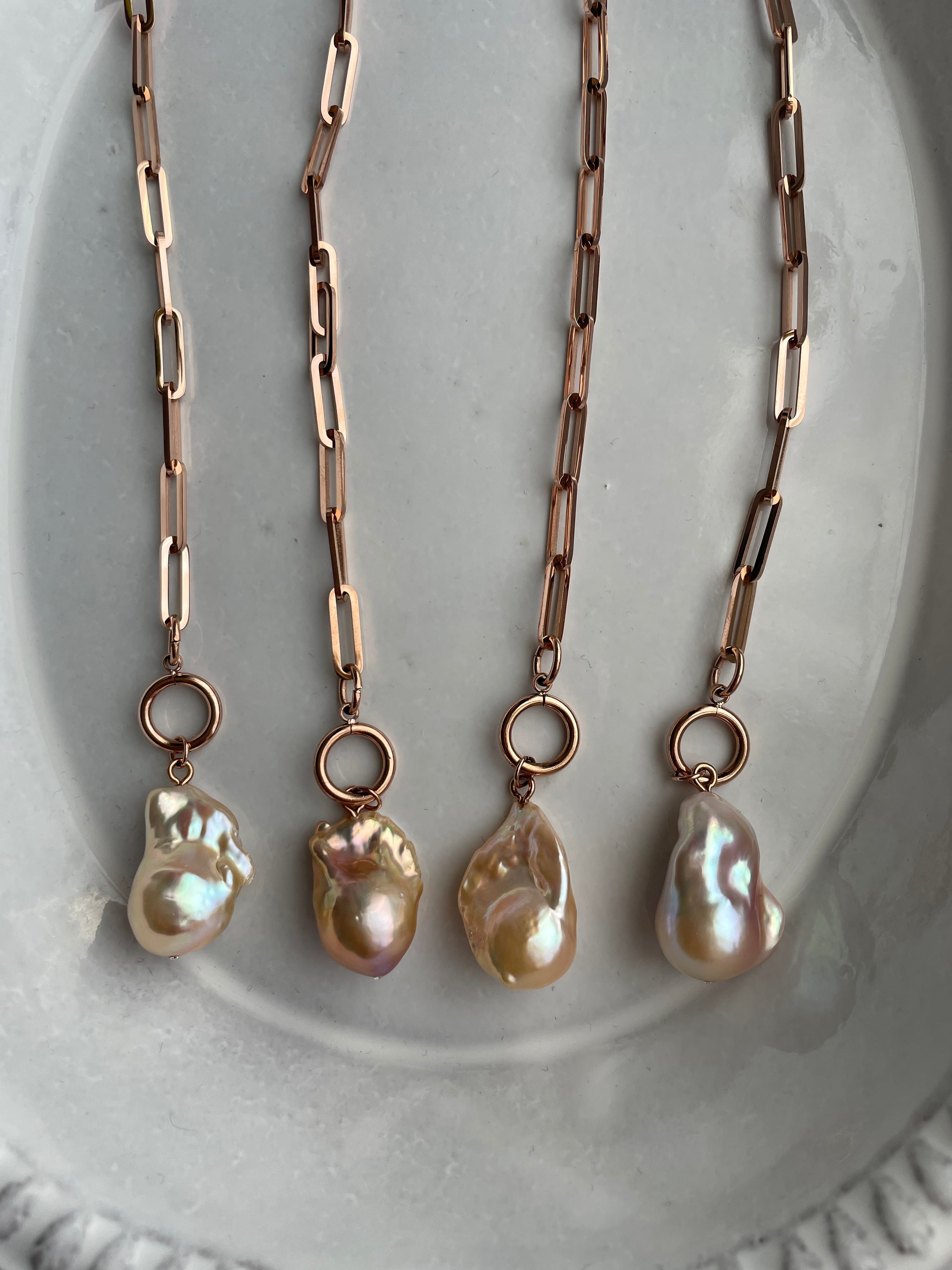 色落ちや何よりアレルギーに強いsus316L にIPメッキ加工をして作り上げたとても安心にお使い頂けて、そしてとても軽いチェーンにテリと艶々の質の良いボリュームのあるpink goldにとても相性の良いナチュラルカラーのほんのりピンクカラーのバロックpearlをお付けしました。