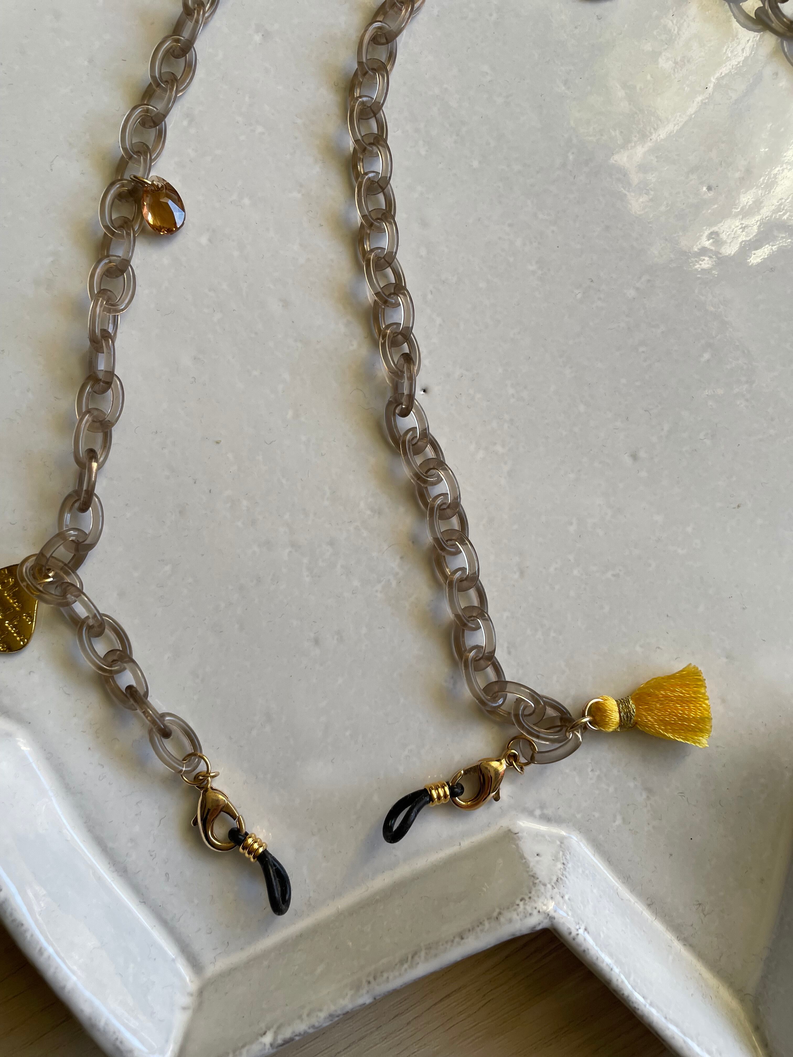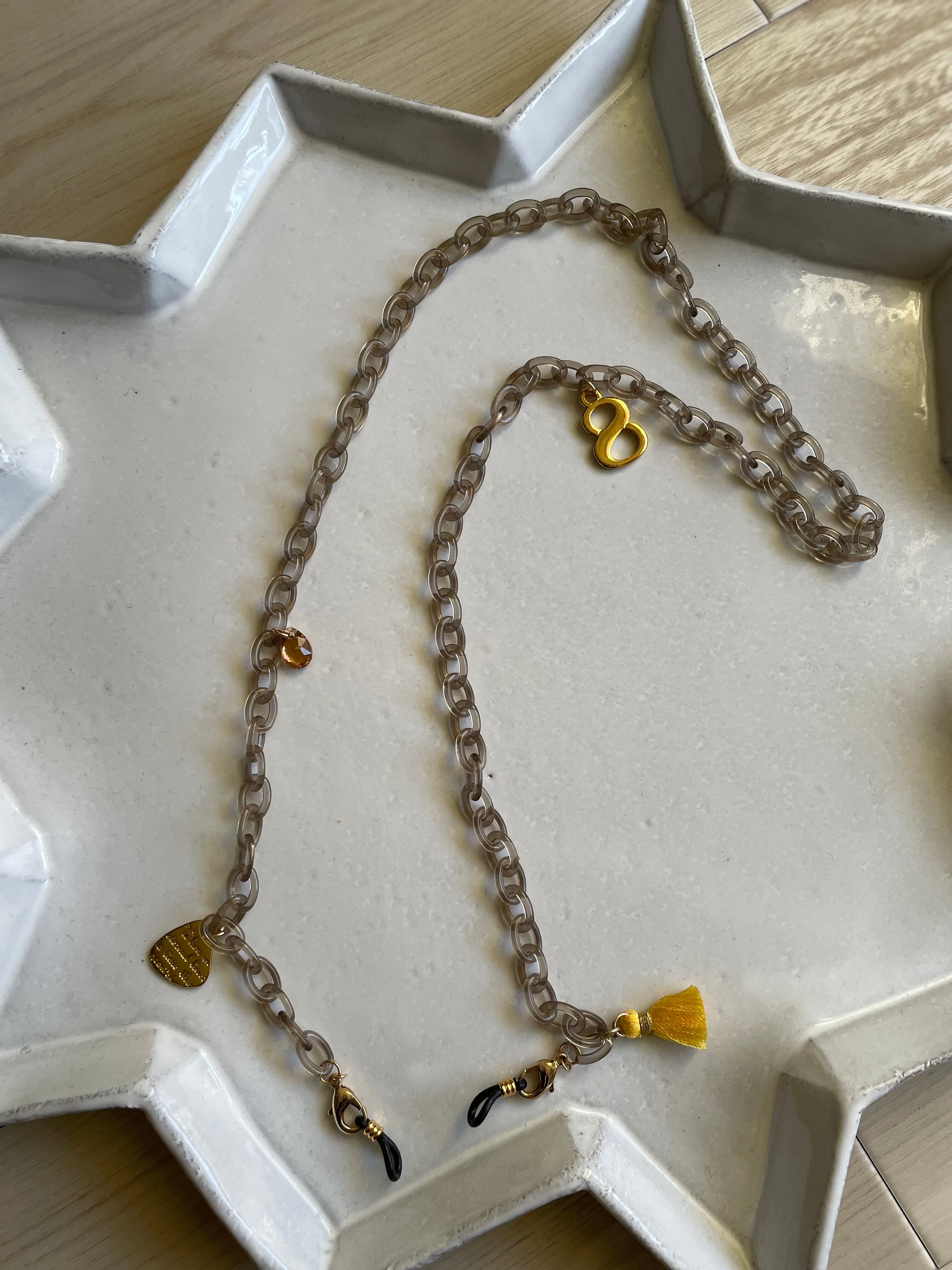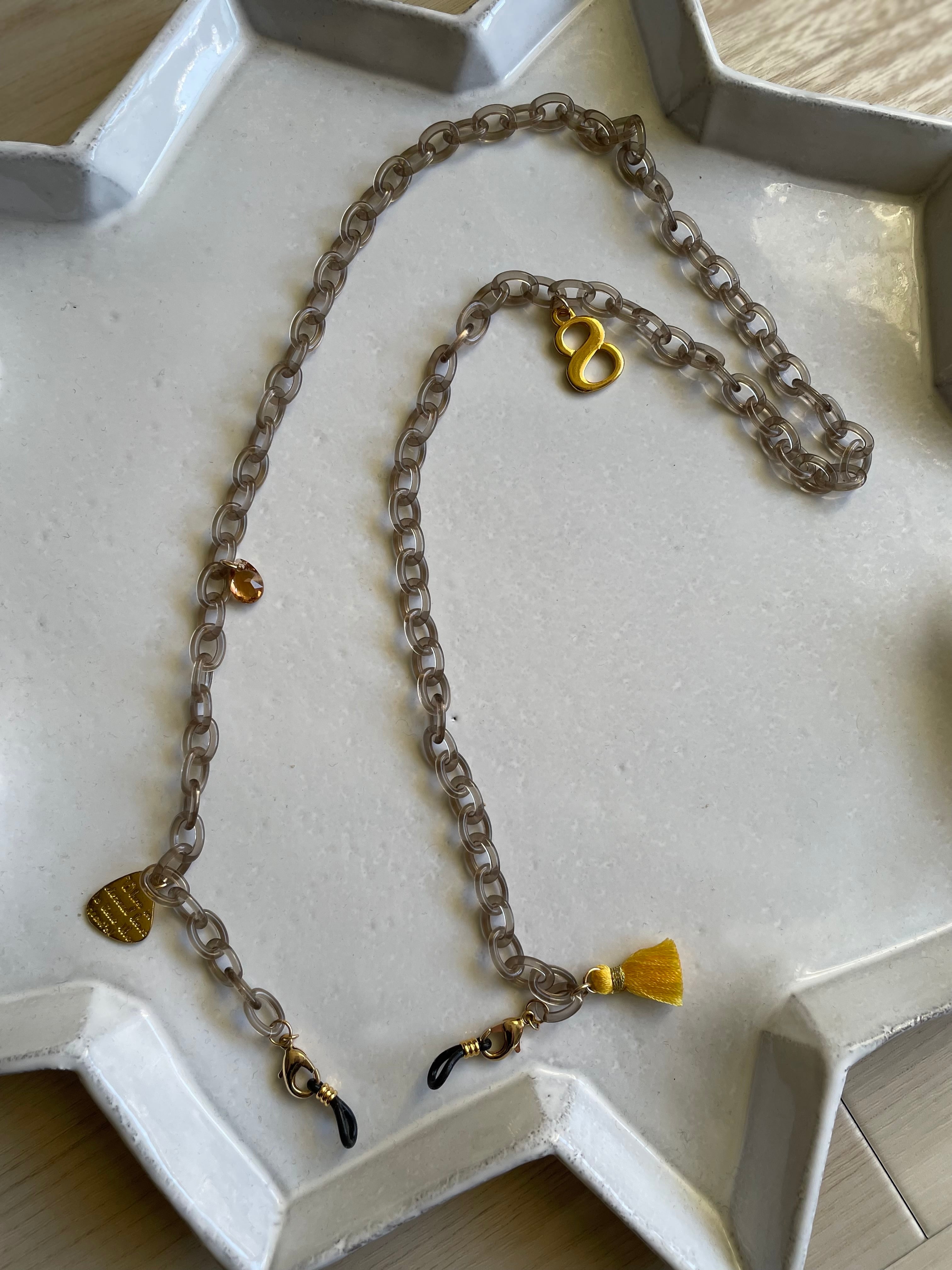 とにかく軽くて使いやすいプラスチックのチェーンをメガネストラップと携帯ストラップにもできるマルチな使い方にしたものです。