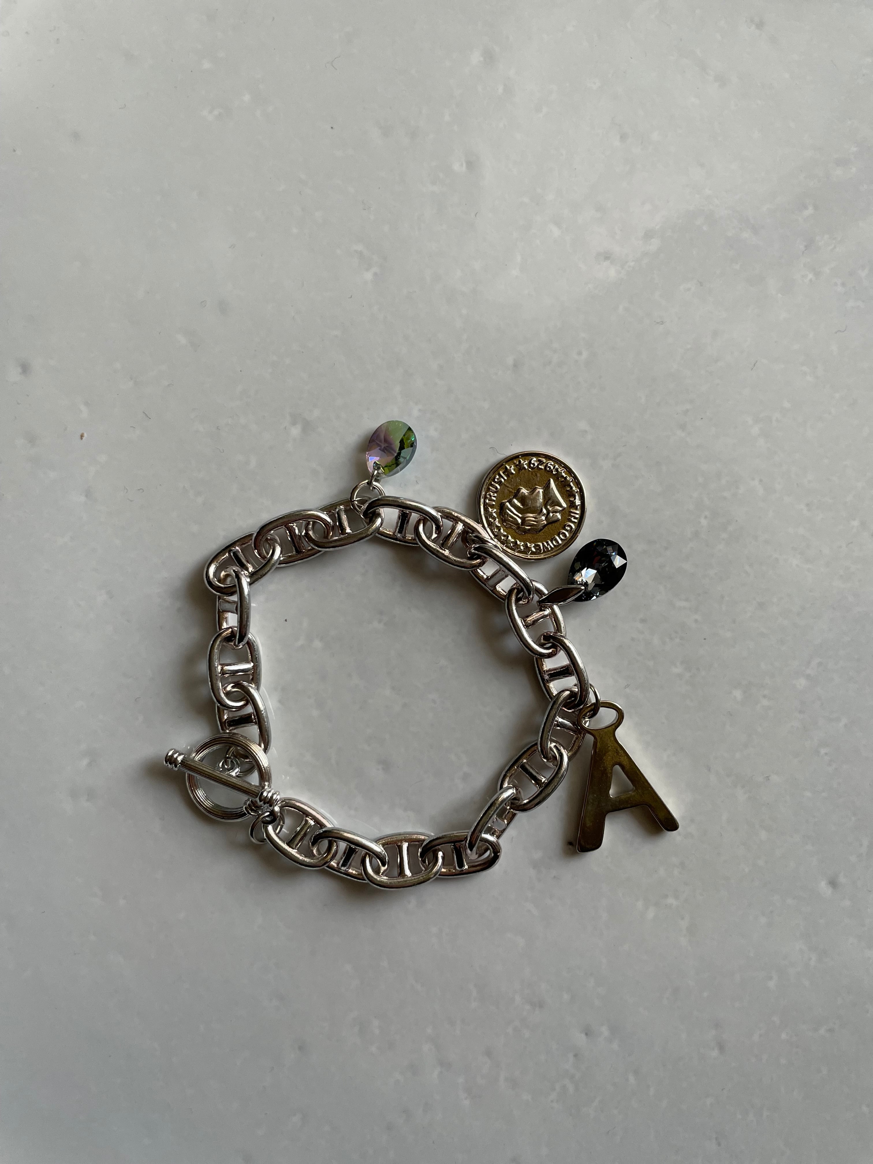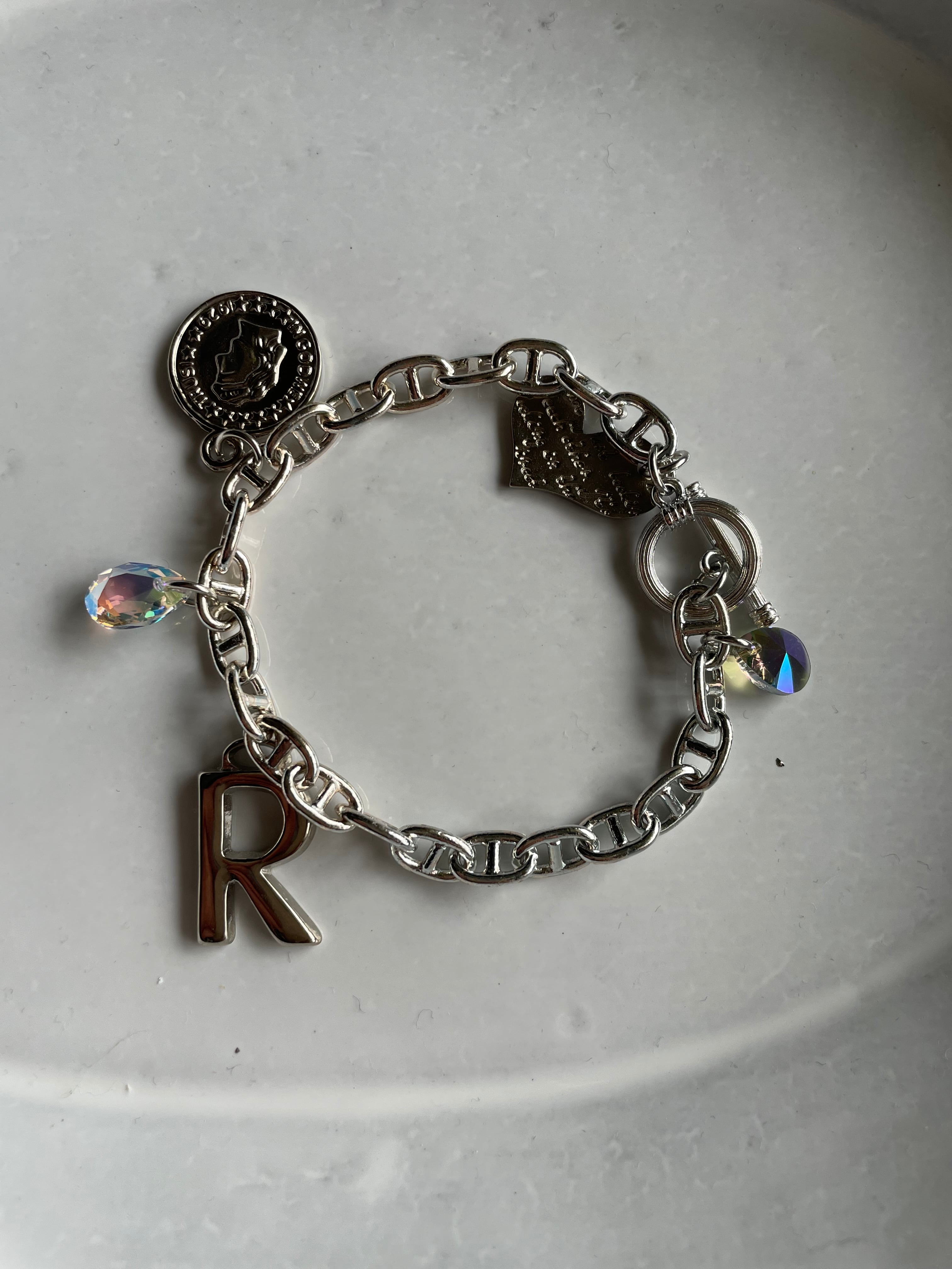 silver chainにcharmとクリスタルガラスをつけた大人の遊び心あるブレスレットです。